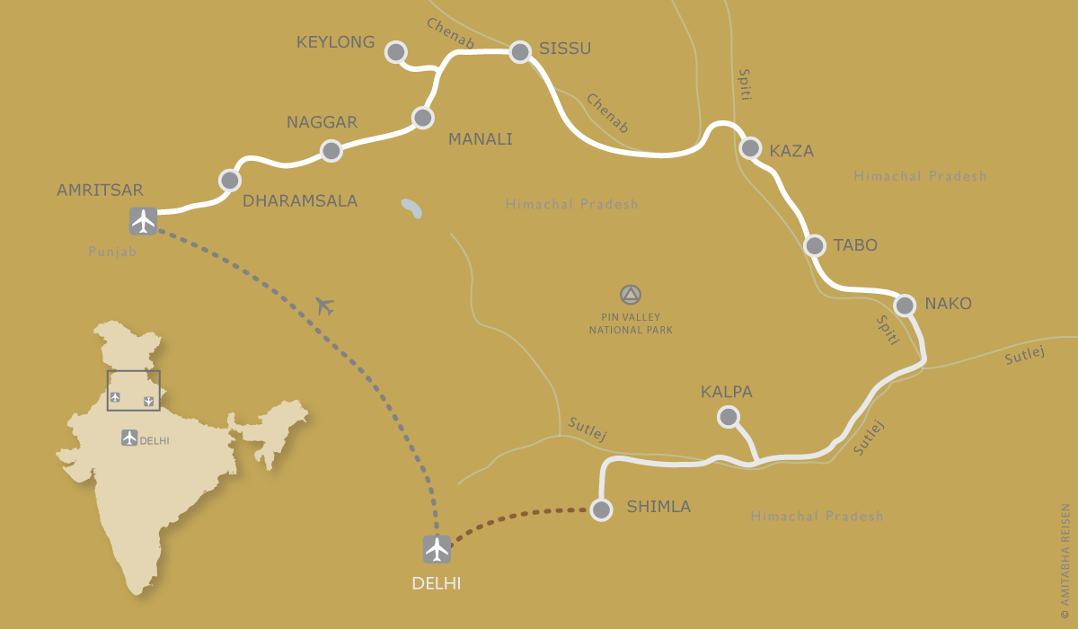 Diese sehr abwechslungsreiche Reise führt durch üppig grüne Landschaften des Vorhimalayas hinauf zu menschenleeren und abgelegenen Hochtälern. Die erste Station Ihrer Reise ist Amritsar. Dort besichtigen wir den Goldenen Tempel, das spirituelle Zentrum der Religionsgemeinschaft der Sikhs. Danach geht es weiter in Richtung Himalaya nach Dharamsala, der Residenz seiner Heiligkeit des Dalai Lama. Nachdem wir hier Bekanntschaft mit dem tibetischen Buddhismus machten, führt die Reise nach Naggar, einstiger Wohnsitz der hinduistischen Könige des Kullu Tals. Nach einem Stop in Manali fahren wir durch den im Oktober 2020 eingeweihten Atal Tunnel nach Sissu. Dieser neue 8 km lange Tunnel, auf einer Höhe von über 3000 m, gilt als der längste Tunnel der Welt auf einer solchen Höhe und ist Stolz der Nation. Nach einer knapp 25 Minuten dauernden Fahrt durch den Tunnel, befindet man sich plötzlich in einer vorwiegend buddhistisch geprägten Gegend und auch das Landschaftsbild hat sich dramatisch zu einer immer kargeren, schrofferen und menschenleeren Bergwelt verändert.