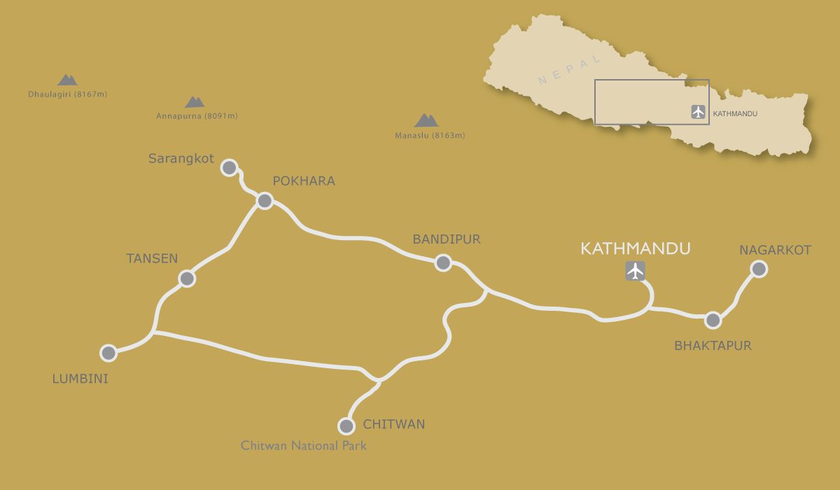 Die Reiseroute führt uns von den urbanen Zentren des Kathmandu-Tals über die malerischen Hügel Mittelnepals bis in das Tiefland nach Lumbini, dem Geburtsort Siddhartha Gautamas, des historischen Buddha. Dieser spirituell bedeutende Ort ist heute eine Stätte des Weltkulturerbes und zieht Gläubige und Suchende aus aller Welt an.