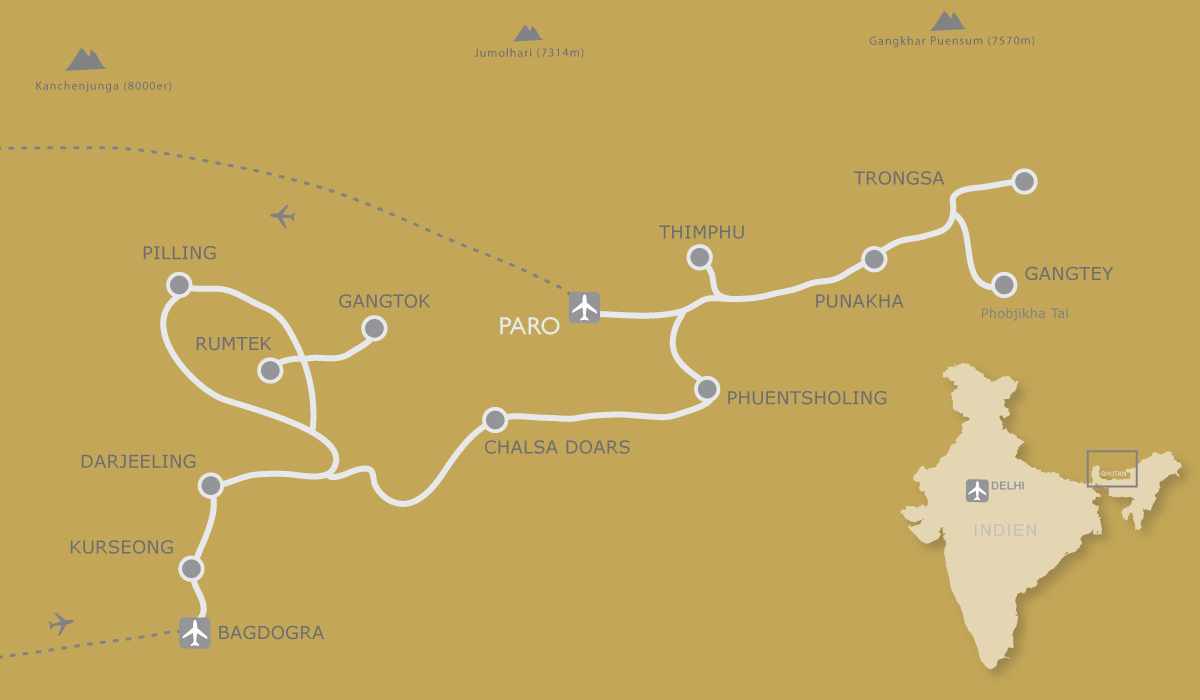 - Sämtliche Transfers mit Privatautos in Darjeeling/Sikkim und in Bhutan bequemen Minibus