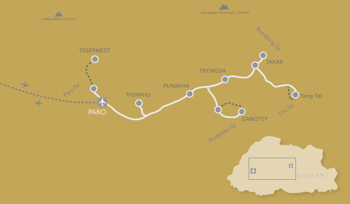 Am frühen Morgen erfolgt der Flug nach Paro. Bei gutem Wetter haben Sie eine atemberaubende Sicht auf die faszinierende Bergwelt des Himalayas und einer ebenso spektakulären Landung auf dem kleinen Flug- hafen in Paro. Am internationalen Flughafen von Paro werden Sie abgeholt.
