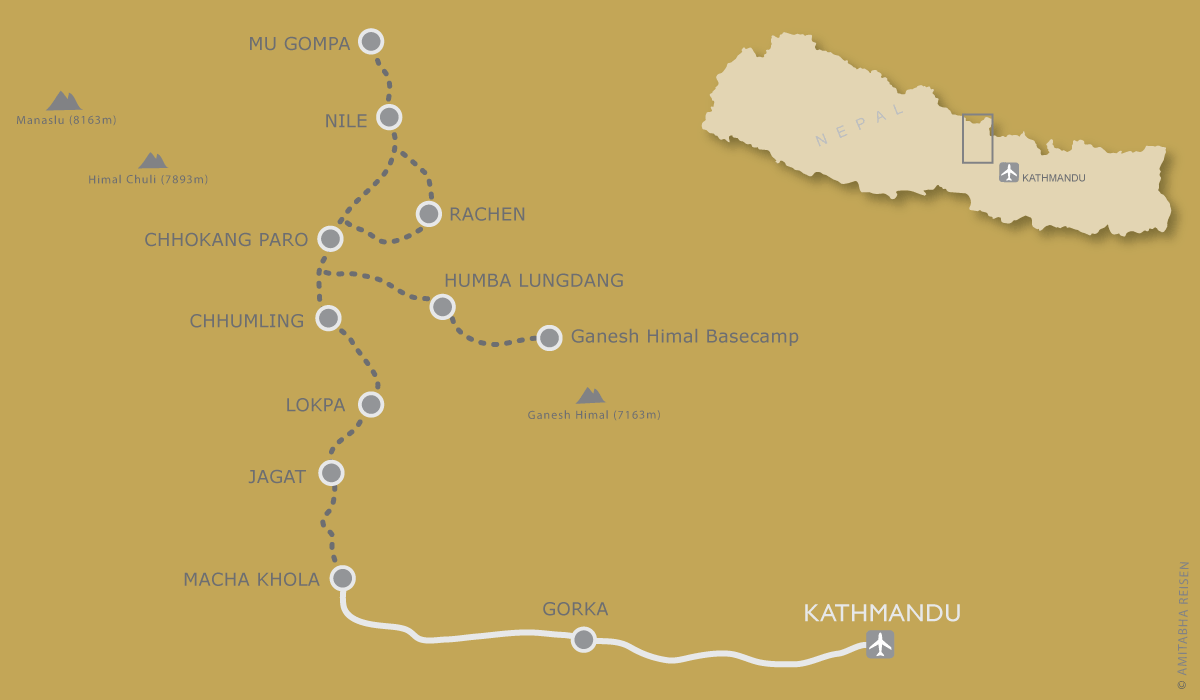 Dieser Trek gehört zu den mittelschweren Wanderungen. Sie sollten über eine gute Gesundheit verfügen und Wander erfahren sein. Es ist wichtig, dass Sie Tritt sicher sind, die Wege führen manchmal über Geröll oder Schotter, wir überqueren Bäche und Flüsse auf langen Hänge/ manchmal Holzbrücken. Ausdauer, denn es geht manchmal steil hinauf und steil hinab, eine gute Kondition und viel Teamgeist sind gefragt. Der höchste Punkt auf dieser Trekkingtour wird das Base Camp von Ganesh Himal auf 4200m sein, geplant als Tagesausflug von Mu. Alle Übernachtungen sind unter 4000 m gelegen, die höchste Übernachtung in Mu Gompa bei 3700m. Da wir langsam hinauf steigen, täglich etwas höher kommen, ist genügend Zeit fuer die Höhenanpassung gegeben. Die meisten unserer als mittelschwer bis anspruchsvoll eingestuften Wanderungen beinhalten nur die Mitnahme eines Tagesrucksacks, Ihr restliches Gepäck wird von den Träger transportiert.